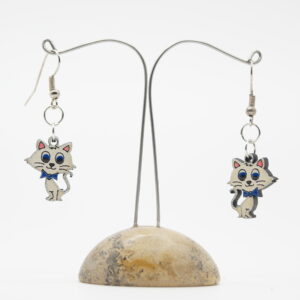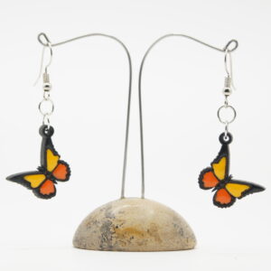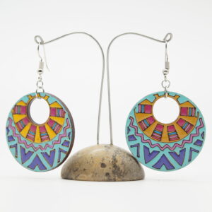 Visací květinové náušnice. Okvětní lístky jsou vyrobené z nabarvených semínek, zezadu jsou spojené kovovým plíškem s motivem měsíce.