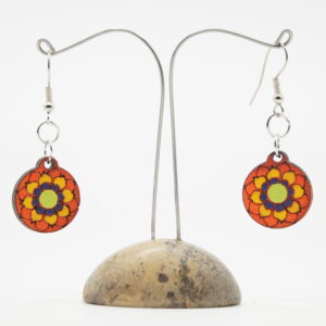 Visací květinové náušnice. Okvětní lístky jsou vyrobené z nabarvených semínek, zezadu jsou spojené kovovým plíškem s motivem měsíce.
