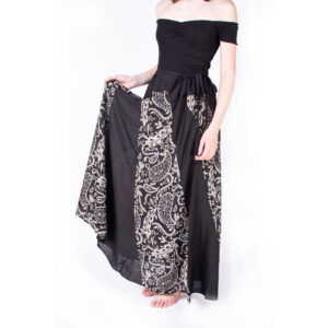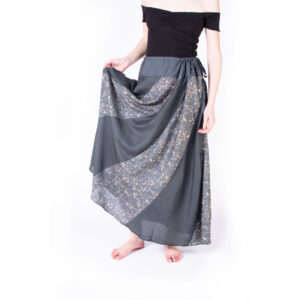 Krátká splývavá sukně z barevných batikovaných pruhů, v pase na gumu. Batikovaná sukně je ušitá z kvalitního jemného, nemačkavého a pružného viskózového úpletu s příměsí spandexu (elastanu).